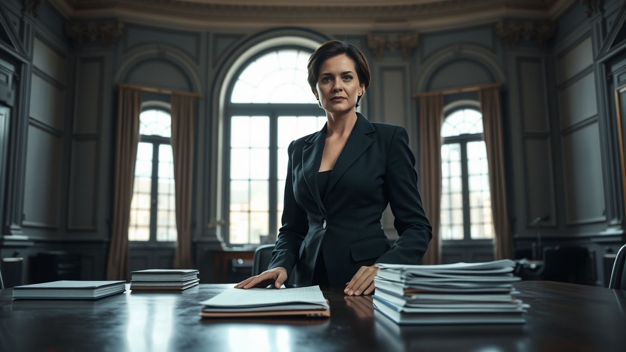 {"prompt":"A wide, landscape shot of a determined, poised woman, representative of a high-ranking French government official, with short, professional hair, dressed in a dark, tailored business suit. She stands or sits with quiet authority behind a large, polished dark wood desk, subtly scattered with stacks of important documents and a discreet laptop, indicating deep engagement with complex dossiers. The setting is a grand, classic French government office interior, featuring high ceilings, elegant cornices, and large arched windows through which soft, diffused natural light enters. The walls are in muted, dignified tones such as stone gray or a deep cream, suggesting gravitas and historical weight. The lighting is soft and ambient, emphasizing her resolute expression and casting subtle shadows that add depth. The overall color palette is sophisticated, featuring cool grays, deep blues, rich browns, and ivory, conveying a serious, professional, and authoritative tone. No text, logos, watermarks, or visible explicit national symbols.","originalPrompt":"A wide, landscape shot of a determined, poised woman, representative of a high-ranking French government official, with short, professional hair, dressed in a dark, tailored business suit. She stands or sits with quiet authority behind a large, polished dark wood desk, subtly scattered with stacks of important documents and a discreet laptop, indicating deep engagement with complex dossiers. The setting is a grand, classic French government office interior, featuring high ceilings, elegant cornices, and large arched windows through which soft, diffused natural light enters. The walls are in muted, dignified tones such as stone gray or a deep cream, suggesting gravitas and historical weight. The lighting is soft and ambient, emphasizing her resolute expression and casting subtle shadows that add depth. The overall color palette is sophisticated, featuring cool grays, deep blues, rich browns, and ivory, conveying a serious, professional, and authoritative tone. No text, logos, watermarks, or visible explicit national symbols.","width":1280,"height":720,"seed":42,"model":"flux","enhance":false,"nologo":true,"negative_prompt":"worst quality, blurry","nofeed":false,"safe":false,"quality":"medium","image":[],"transparent":false,"isMature":false,"isChild":false}