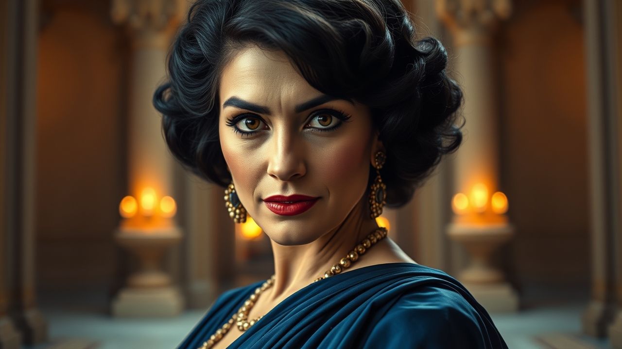 {"prompt":"A wide, majestic, and high-resolution cinematic portrait of Elizabeth Taylor in her prime, circa 1960s, exuding iconic Hollywood glamour, strength, and timeless allure. She is captured in a medium close-up, gazing directly at the viewer with her striking, intelligent eyes that subtly hint at a deep violet hue. Her dark, lustrous hair is styled in elegant, voluminous waves. She wears a luxurious, flowing gown in rich jewel tones of deep sapphire blue and gold, with draped fabric and subtle detailing that evoke a sense of opulent regality, subtly referencing her iconic role as Cleopatra without being a literal costume. The background is softly blurred yet grand, suggesting an opulent film set, an ancient architectural hall, or a luxurious premiere event, with warm, golden ambient lighting. Dramatic, cinematic lighting illuminates her face and highlights the textures of her attire, creating a radiant glow on her skin and emphasizing her magnetic presence. The composition is balanced and powerful, capturing her legendary beauty and indomitable spirit. Realistic style, no text, logos, or watermarks.","originalPrompt":"A wide, majestic, and high-resolution cinematic portrait of Elizabeth Taylor in her prime, circa 1960s, exuding iconic Hollywood glamour, strength, and timeless allure. She is captured in a medium close-up, gazing directly at the viewer with her striking, intelligent eyes that subtly hint at a deep violet hue. Her dark, lustrous hair is styled in elegant, voluminous waves. She wears a luxurious, flowing gown in rich jewel tones of deep sapphire blue and gold, with draped fabric and subtle detailing that evoke a sense of opulent regality, subtly referencing her iconic role as Cleopatra without being a literal costume. The background is softly blurred yet grand, suggesting an opulent film set, an ancient architectural hall, or a luxurious premiere event, with warm, golden ambient lighting. Dramatic, cinematic lighting illuminates her face and highlights the textures of her attire, creating a radiant glow on her skin and emphasizing her magnetic presence. The composition is balanced and powerful, capturing her legendary beauty and indomitable spirit. Realistic style, no text, logos, or watermarks.","width":1280,"height":720,"seed":42,"model":"flux","enhance":false,"nologo":true,"negative_prompt":"undefined","nofeed":false,"safe":false,"quality":"medium","image":[],"transparent":false,"isMature":false,"isChild":false}