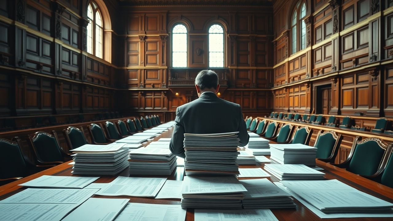 {"prompt":"A wide, panoramic landscape shot of a grand, classical committee room inside a historic European parliament building, reminiscent of the French National Assembly. At the head of a long, highly polished mahogany table, a central figure, seen from a three-quarter angle or from behind, is deeply engrossed in examining a stack of voluminous financial documents. The table is covered with meticulously arranged stacks of thick ledgers, detailed spreadsheets, printed graphs, and official reports, conveying a sense of intense scrutiny and complex financial analysis. Soft, diffused natural light streams in from tall, arched windows in the background, illuminating the scene with a serious yet clear ambiance. The room features ornate wooden paneling, subtle classical architectural details, and perhaps empty, traditional velvet-covered chairs lining the table. The color palette is dominated by rich browns of the wood, deep professional greens or blues for the upholstery, and crisp whites/creams for the papers, with subtle hints of brass or gold in the fixtures. The composition emphasizes the weighty nature of the financial documents and the focused attention given to them, symbolizing parliamentary control and strategic opposition, without any text, logos, or watermarks.","originalPrompt":"A wide, panoramic landscape shot of a grand, classical committee room inside a historic European parliament building, reminiscent of the French National Assembly. At the head of a long, highly polished mahogany table, a central figure, seen from a three-quarter angle or from behind, is deeply engrossed in examining a stack of voluminous financial documents. The table is covered with meticulously arranged stacks of thick ledgers, detailed spreadsheets, printed graphs, and official reports, conveying a sense of intense scrutiny and complex financial analysis. Soft, diffused natural light streams in from tall, arched windows in the background, illuminating the scene with a serious yet clear ambiance. The room features ornate wooden paneling, subtle classical architectural details, and perhaps empty, traditional velvet-covered chairs lining the table. The color palette is dominated by rich browns of the wood, deep professional greens or blues for the upholstery, and crisp whites/creams for the papers, with subtle hints of brass or gold in the fixtures. The composition emphasizes the weighty nature of the financial documents and the focused attention given to them, symbolizing parliamentary control and strategic opposition, without any text, logos, or watermarks.","width":1280,"height":720,"seed":42,"model":"flux","enhance":false,"nologo":true,"negative_prompt":"worst quality, blurry","nofeed":false,"safe":false,"quality":"medium","image":[],"transparent":false,"isMature":false,"isChild":false}