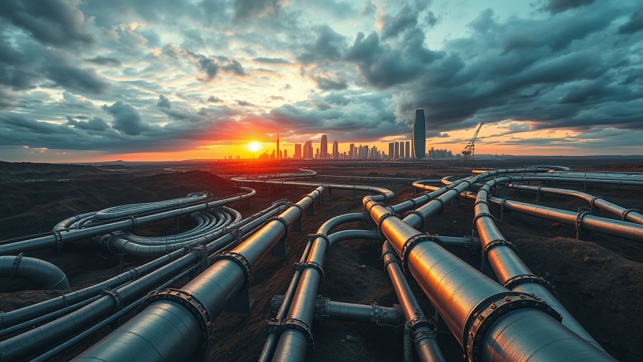 {"prompt":"A panoramic, wide-angle landscape capturing an expansive industrial scene. In the foreground and midground, intricate networks of massive, steel-colored pipelines wind across rugged terrain, their imposing presence symbolizing economic strength and resilience. These conduits lead toward a sleek, contemporary Asian metropolis on the horizon, its skyline softly outlined against the fading light, glowing warmly from the setting sun. The sky overhead is tumultuous, filled with swirling storm clouds that evoke themes of global economic instability, yet a few powerful rays of sunlight pierce through, bathing the scene in a reassuring amber hue. The colour palette creates vivid contrasts: cold silvery and slate tones of the pipelines and earthbound landscape intermingle with the fiery oranges, crimson reds, and deep violet shadows of the sunset sky and distant city. The scene is stark, free of text, logos, or human presence, emphasizing the formidable infrastructure and its strategic geopolitical significance. The image should evoke a realistic, slightly majestic atmosphere, emphasizing strength and endurance amidst global turbulence.\n\nA wide, landscape-format image depicting a vast, robust industrial landscape. In the midground and foreground, a complex network of large, grey-metallic oil and gas pipelines snakes across the terrain, appearing strong and functional, symbolizing the backbone of a resilient economy. These pipelines converge and stretch towards a distant, modern Asian city skyline on the horizon, which is softly silhouetted and illuminated by the warm, golden light of a setting sun. The sky above is dramatic, with swirling clouds hinting at global economic turbulence, yet striking rays of sunlight break through, casting a warm glow over the industrial infrastructure, emphasizing its endurance. The overall color palette features strong contrasts between the cool metals and deep earth tones of the foreground and the warm oranges, reds, and deep purples of the sunset sky and distant cityscape. The scene is devoid of any text, logos, or human figures, focusing purely on the powerful infrastructure and its geopolitical redirection. The visual should be clear, undistorted, and coherent, aiming for a realistic and slightly grand, strategic feel.","originalPrompt":"A wide, landscape-format image depicting a vast, robust industrial landscape. In the midground and foreground, a complex network of large, grey-metallic oil and gas pipelines snakes across the terrain, appearing strong and functional, symbolizing the backbone of a resilient economy. These pipelines converge and stretch towards a distant, modern Asian city skyline on the horizon, which is softly silhouetted and illuminated by the warm, golden light of a setting sun. The sky above is dramatic, with swirling clouds hinting at global economic turbulence, yet striking rays of sunlight break through, casting a warm glow over the industrial infrastructure, emphasizing its endurance. The overall color palette features strong contrasts between the cool metals and deep earth tones of the foreground and the warm oranges, reds, and deep purples of the sunset sky and distant cityscape. The scene is devoid of any text, logos, or human figures, focusing purely on the powerful infrastructure and its geopolitical redirection. The visual should be clear, undistorted, and coherent, aiming for a realistic and slightly grand, strategic feel.","width":1280,"height":720,"seed":42,"model":"flux","enhance":false,"nologo":true,"negative_prompt":"undefined","nofeed":false,"safe":false,"quality":"medium","image":[],"transparent":false,"isMature":false,"isChild":false}
