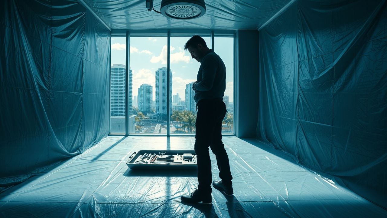 {"prompt":"A wide, cinematic, realistic photograph capturing the unsettling duality of a character reminiscent of Dexter Morgan. The scene is set inside a meticulously prepared 'kill room,' where every surface, from floor to ceiling, is covered in clear, taut plastic sheeting. A male figure, dressed in practical dark clothing, stands with a posture of precise control, meticulously arranging an array of gleaming surgical-like tools on a stainless steel tray. The interior lighting is stark and cool, casting sharp, long shadows from a single overhead industrial light source, emphasizing the sterile and ominous atmosphere. In the background, prominently visible through a large, expansive window, is a vibrant, sun-drenched Miami cityscape with a clear blue sky, towering modern buildings, and lush green palm trees, creating a powerful, ironic contrast between the internal darkness and the external idyllic setting. The composition highlights the tension between the confined, dark space and the bright, free world outside. No text, logos, or watermarks.","originalPrompt":"A wide, cinematic, realistic photograph capturing the unsettling duality of a character reminiscent of Dexter Morgan. The scene is set inside a meticulously prepared 'kill room,' where every surface, from floor to ceiling, is covered in clear, taut plastic sheeting. A male figure, dressed in practical dark clothing, stands with a posture of precise control, meticulously arranging an array of gleaming surgical-like tools on a stainless steel tray. The interior lighting is stark and cool, casting sharp, long shadows from a single overhead industrial light source, emphasizing the sterile and ominous atmosphere. In the background, prominently visible through a large, expansive window, is a vibrant, sun-drenched Miami cityscape with a clear blue sky, towering modern buildings, and lush green palm trees, creating a powerful, ironic contrast between the internal darkness and the external idyllic setting. The composition highlights the tension between the confined, dark space and the bright, free world outside. No text, logos, or watermarks.","width":1280,"height":720,"seed":42,"model":"flux","enhance":false,"nologo":true,"negative_prompt":"worst quality, blurry","nofeed":false,"safe":false,"quality":"medium","image":[],"transparent":false,"isMature":false,"isChild":false}