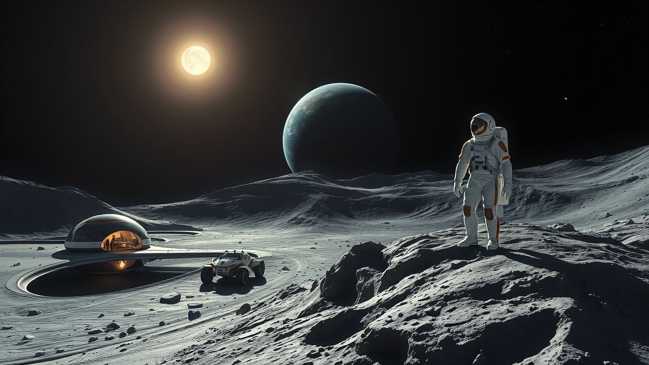 {"prompt":"A wide, cinematic landscape shot of a futuristic, meticulously designed lunar outpost nestled on the rim of a large crater. The scene is bathed in the dramatic side-lighting of a distant sun, casting long, sharp shadows across the textured, dusty lunar surface. In the foreground, sleek, modular habitats with large, transparent domes are interconnected by glowing tunnels, indicating a self-sustaining human presence. A next-generation lunar rover with advanced sensors is parked nearby. In the mid-ground, a lone astronaut, wearing a highly detailed, modern white spacesuit with orange accents (Artemis-style), stands atop a small rise, gazing out towards the curving lunar horizon and the vast expanse of space. Their posture conveys a sense of wonder, determination, and exploration. In the deep background, the vibrant blue and white marble of Earth hangs majestically in the inky blackness, partially illuminated, serving as a poignant reminder of humanity's distant home. The sky is a deep, rich black, dotted with countless pinprick stars and a faint, ethereal nebula. The overall tone is awe-inspiring, aspirational, and hyperrealistic, emphasizing humanity's boundless ambition in space exploration. No text, logos, or watermarks.","originalPrompt":"A wide, cinematic landscape shot of a futuristic, meticulously designed lunar outpost nestled on the rim of a large crater. The scene is bathed in the dramatic side-lighting of a distant sun, casting long, sharp shadows across the textured, dusty lunar surface. In the foreground, sleek, modular habitats with large, transparent domes are interconnected by glowing tunnels, indicating a self-sustaining human presence. A next-generation lunar rover with advanced sensors is parked nearby. In the mid-ground, a lone astronaut, wearing a highly detailed, modern white spacesuit with orange accents (Artemis-style), stands atop a small rise, gazing out towards the curving lunar horizon and the vast expanse of space. Their posture conveys a sense of wonder, determination, and exploration. In the deep background, the vibrant blue and white marble of Earth hangs majestically in the inky blackness, partially illuminated, serving as a poignant reminder of humanity's distant home. The sky is a deep, rich black, dotted with countless pinprick stars and a faint, ethereal nebula. The overall tone is awe-inspiring, aspirational, and hyperrealistic, emphasizing humanity's boundless ambition in space exploration. No text, logos, or watermarks.","width":1280,"height":720,"seed":42,"model":"flux","enhance":false,"nologo":true,"negative_prompt":"worst quality, blurry","nofeed":false,"safe":false,"quality":"medium","image":[],"transparent":false,"isMature":false,"isChild":false}