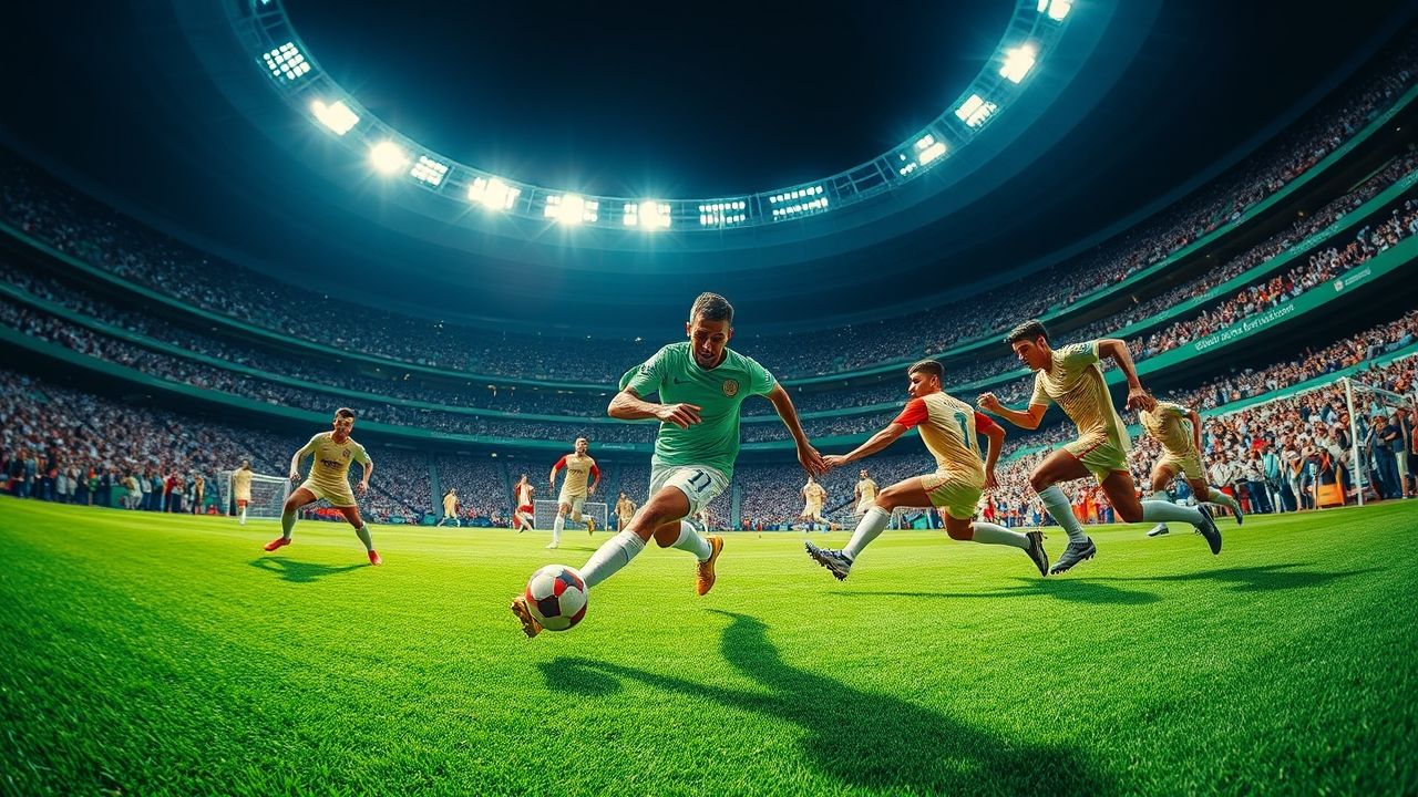 {"prompt":"A panoramic, vivid depiction of a crucial moment in a high-stakes football match set within a sprawling, state-of-the-art South American stadium illuminated at night. The scene centers on a talented player clad in a simple green and white uniform, captured mid-sprint with dynamic motion as he fiercely advances the ball toward the opposition's goal. Surrounding him are two or three relentless defenders dressed in plain cream and red attire, lunging and pressing in an energetic bid to intercept, their bodies stretched in effort to thwart the attacking play. The lush, meticulously maintained pitch radiates a rich, deep green, contrasting sharply with the bright, shimmering floodlights overhead that cast stark, dramatic shadows across the field and the athletes. Behind this intense action, the stands teem with a sea of enthusiastic spectators, their blurred forms alive with anticipation and cheers, fueling the electric atmosphere. The viewpoint is a low-angle perspective from the sideline, emphasizing the athletic prowess of the players and the grandeur of the modern stadium -- all rendered with sharp clarity, emphasizing the raw energy and vibrant ambiance without any textual elements or branding.\n\nA wide, dynamic, and realistic landscape image capturing a pivotal moment during an intense football (soccer) match in a vast, modern South American stadium at night. The scene focuses on a skilled player from the home team (wearing generic green and white kit, no visible logos or text) in full stride, driving the ball with powerful determination towards the opponent's goal. He is being actively challenged by two or three determined players from the opposing team (wearing generic cream and red kits, no visible logos or text), who are lunging, blocking, or in close pursuit, showcasing their resilience and defensive effort. The pitch is a vibrant, perfectly manicured green. Behind the players, the stadium stands are packed to capacity with a blur of passionate, cheering fans, their collective energy palpable. Bright, powerful stadium floodlights cast dramatic shadows and highlights across the field and players, emphasizing the speed and intensity of the action. The overall lighting is crisp and clear, illuminating the scene vividly against a dark night sky. The composition is a low-angle shot from the side of the pitch, conveying the athleticism of the players and the grandeur of the stadium, without any text, logos, watermarks, or other typographic elements.","originalPrompt":"A wide, dynamic, and realistic landscape image capturing a pivotal moment during an intense football (soccer) match in a vast, modern South American stadium at night. The scene focuses on a skilled player from the home team (wearing generic green and white kit, no visible logos or text) in full stride, driving the ball with powerful determination towards the opponent's goal. He is being actively challenged by two or three determined players from the opposing team (wearing generic cream and red kits, no visible logos or text), who are lunging, blocking, or in close pursuit, showcasing their resilience and defensive effort. The pitch is a vibrant, perfectly manicured green. Behind the players, the stadium stands are packed to capacity with a blur of passionate, cheering fans, their collective energy palpable. Bright, powerful stadium floodlights cast dramatic shadows and highlights across the field and players, emphasizing the speed and intensity of the action. The overall lighting is crisp and clear, illuminating the scene vividly against a dark night sky. The composition is a low-angle shot from the side of the pitch, conveying the athleticism of the players and the grandeur of the stadium, without any text, logos, watermarks, or other typographic elements.","width":1280,"height":720,"seed":42,"model":"flux","enhance":false,"nologo":true,"negative_prompt":"undefined","nofeed":false,"safe":false,"quality":"medium","image":[],"transparent":false,"isMature":false,"isChild":false}