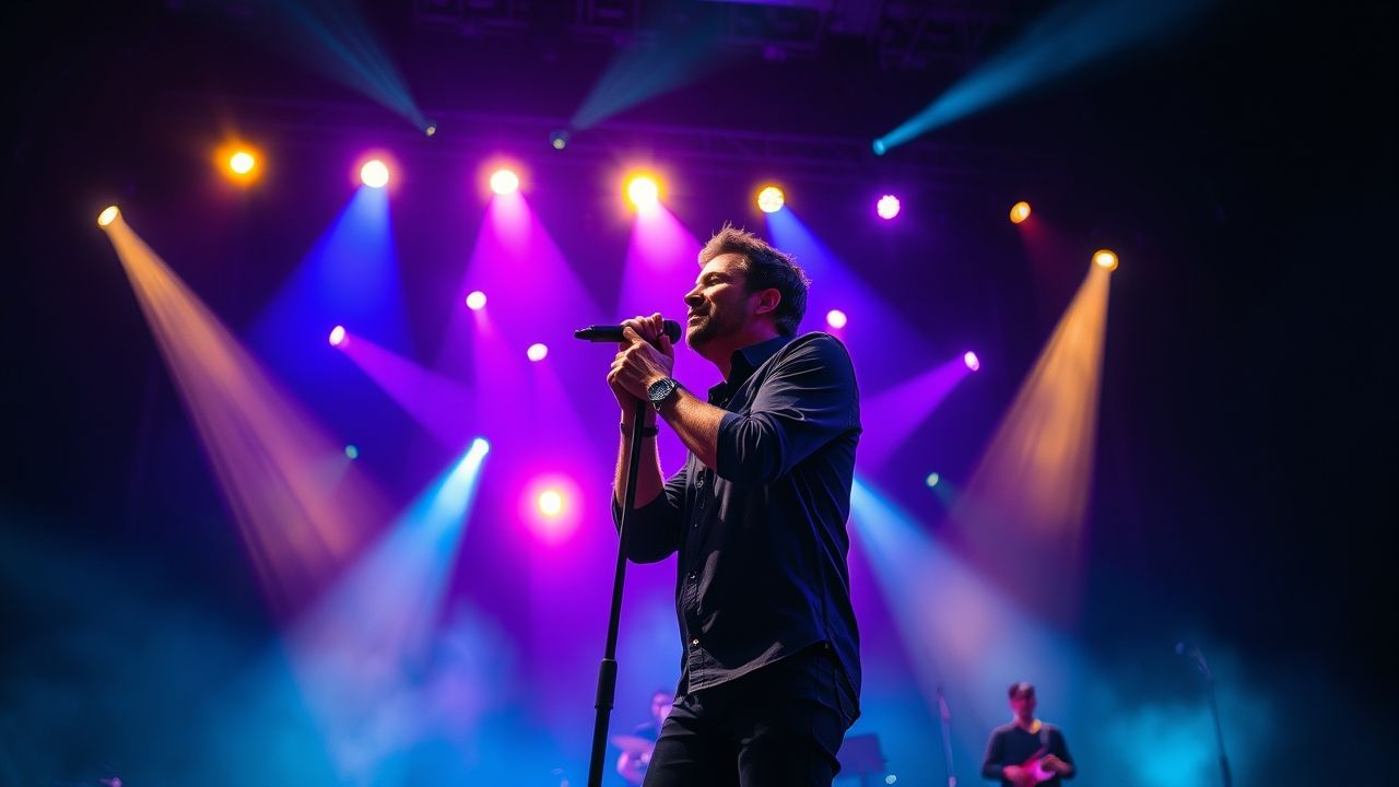 {"prompt":"A wide (landscape) shot of French singer-songwriter Pascal Obispo passionately performing on a grand concert stage. He is captured mid-song, holding a microphone with both hands or one hand gripping the stand, deeply immersed in the music with a powerful and emotional expression. The stage is bathed in dramatic, vibrant concert lighting, featuring a mix of deep blues, intense purples, and warm golden spotlights that create strong contrasts and highlight his figure. A subtle theatrical haze hangs in the air, catching the light. The background is dark, with the blurred outlines of stage equipment and instruments subtly visible, ensuring the focus remains squarely on the artist. The image should convey his commanding stage presence, artistic intensity, and the energetic atmosphere of a live performance, rendered with a realistic, high-quality concert photography aesthetic, devoid of any text, logos, or watermarks.","originalPrompt":"A wide (landscape) shot of French singer-songwriter Pascal Obispo passionately performing on a grand concert stage. He is captured mid-song, holding a microphone with both hands or one hand gripping the stand, deeply immersed in the music with a powerful and emotional expression. The stage is bathed in dramatic, vibrant concert lighting, featuring a mix of deep blues, intense purples, and warm golden spotlights that create strong contrasts and highlight his figure. A subtle theatrical haze hangs in the air, catching the light. The background is dark, with the blurred outlines of stage equipment and instruments subtly visible, ensuring the focus remains squarely on the artist. The image should convey his commanding stage presence, artistic intensity, and the energetic atmosphere of a live performance, rendered with a realistic, high-quality concert photography aesthetic, devoid of any text, logos, or watermarks.","width":1280,"height":720,"seed":42,"model":"flux","enhance":false,"nologo":true,"negative_prompt":"worst quality, blurry","nofeed":false,"safe":false,"quality":"medium","image":[],"transparent":false,"isMature":false,"isChild":false}