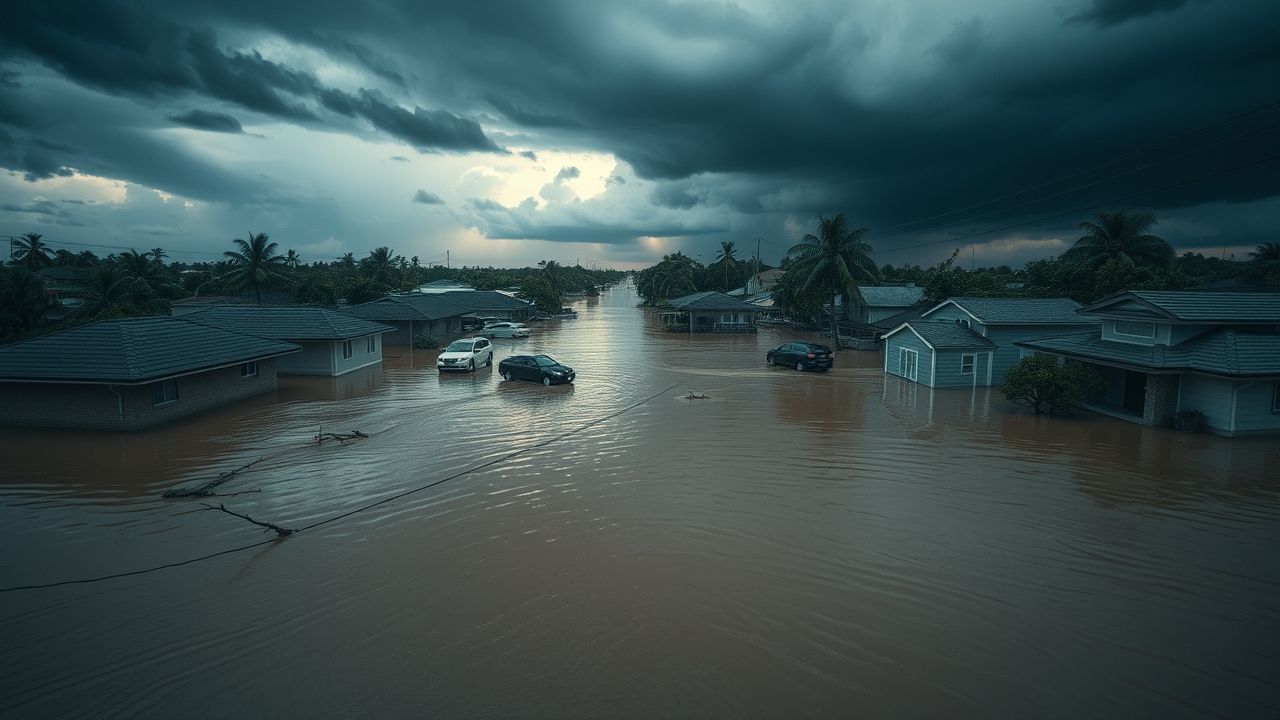 {"prompt":"A wide, cinematic landscape shot capturing the aftermath of a severe tropical storm. The scene depicts a residential street or small town area completely submerged by murky, brown floodwaters, reaching up to the second stories of houses. Only the roofs and upper windows of homes are visible above the water line, with some partially submerged vehicles and debris like broken tree branches and overturned bins floating on the surface. The sky is dominated by dense, heavy, dark gray and deep blue storm clouds, with faint, dramatic light breaking through on the distant horizon, suggesting the storm is moving away but its impact is immense. Lingering heavy rain or recent downpour creates a wet, reflective surface on the water. The overall color palette is desaturated, focusing on somber blues, grays, and muddy browns, with subtle green tones from surviving vegetation. The composition emphasizes the vastness of the flooding and the power of nature, with no human figures, text, or logos. The image should be clear, detailed, and realistic, conveying a sense of profound devastation and the quiet aftermath of a natural disaster.","originalPrompt":"A wide, cinematic landscape shot capturing the aftermath of a severe tropical storm. The scene depicts a residential street or small town area completely submerged by murky, brown floodwaters, reaching up to the second stories of houses. Only the roofs and upper windows of homes are visible above the water line, with some partially submerged vehicles and debris like broken tree branches and overturned bins floating on the surface. The sky is dominated by dense, heavy, dark gray and deep blue storm clouds, with faint, dramatic light breaking through on the distant horizon, suggesting the storm is moving away but its impact is immense. Lingering heavy rain or recent downpour creates a wet, reflective surface on the water. The overall color palette is desaturated, focusing on somber blues, grays, and muddy browns, with subtle green tones from surviving vegetation. The composition emphasizes the vastness of the flooding and the power of nature, with no human figures, text, or logos. The image should be clear, detailed, and realistic, conveying a sense of profound devastation and the quiet aftermath of a natural disaster.","width":1280,"height":720,"seed":42,"model":"flux","enhance":false,"nologo":true,"negative_prompt":"undefined","nofeed":false,"safe":false,"quality":"medium","image":[],"transparent":false,"isMature":false,"isChild":false}