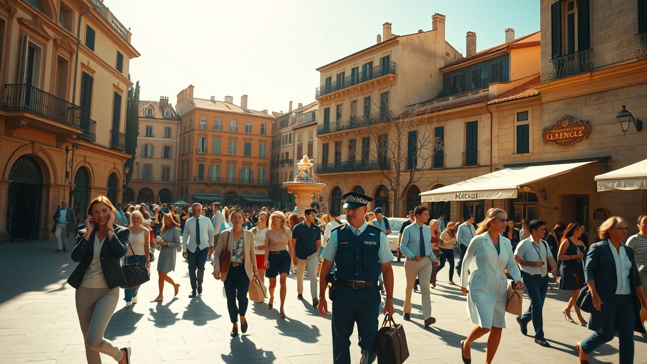 {"prompt":"A wide, sun-drenched, cinematic shot of a lively public square in Montpellier, France. The scene captures the essence of daily life, with a diverse mix of people bustling about. Prominently featured are individuals subtly representing different societal roles: a smartly dressed professional making a phone call, a police officer in uniform walking by, a doctor or nurse entering/exiting a building, a family enjoying an outdoor cafe, and various everyday citizens. The architecture is distinctly Southern French, featuring warm stone buildings, terracotta rooftops, and perhaps a classic fountain or a few Mediterranean trees. The lighting is bright and natural, with golden sunlight illuminating the scene and casting soft, realistic shadows, evoking the 'grand soleil' (big sun) mentioned in the title. The color palette is warm and inviting, dominated by ochres, blues, and greens, reflecting the vibrancy of a Mediterranean city. The composition emphasizes the interconnectedness of the various elements and people, creating a sense of a community where diverse lives intersect, mirroring the complex narratives of a daily soap opera. No text, logos, or watermarks are present. The image should be clear, undistorted, and visually coherent with a realistic appearance.","originalPrompt":"A wide, sun-drenched, cinematic shot of a lively public square in Montpellier, France. The scene captures the essence of daily life, with a diverse mix of people bustling about. Prominently featured are individuals subtly representing different societal roles: a smartly dressed professional making a phone call, a police officer in uniform walking by, a doctor or nurse entering/exiting a building, a family enjoying an outdoor cafe, and various everyday citizens. The architecture is distinctly Southern French, featuring warm stone buildings, terracotta rooftops, and perhaps a classic fountain or a few Mediterranean trees. The lighting is bright and natural, with golden sunlight illuminating the scene and casting soft, realistic shadows, evoking the 'grand soleil' (big sun) mentioned in the title. The color palette is warm and inviting, dominated by ochres, blues, and greens, reflecting the vibrancy of a Mediterranean city. The composition emphasizes the interconnectedness of the various elements and people, creating a sense of a community where diverse lives intersect, mirroring the complex narratives of a daily soap opera. No text, logos, or watermarks are present. The image should be clear, undistorted, and visually coherent with a realistic appearance.","width":1280,"height":720,"seed":42,"model":"flux","enhance":false,"nologo":true,"negative_prompt":"undefined","nofeed":false,"safe":false,"quality":"medium","image":[],"transparent":false,"isMature":false,"isChild":false}