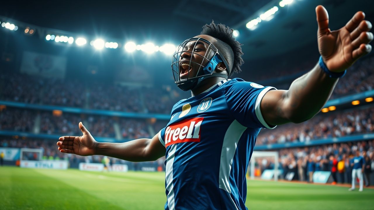 {"prompt":"A dynamic, wide-angle, hyper-realistic shot of Nigerian football star Victor Osimhen, prominently featuring his distinctive protective face mask, in a moment of triumphant celebration on a floodlit football pitch at night. He is captured in a powerful, athletic pose, arms possibly outstretched or raised in exhilaration, embodying his speed, power, and impact. The background is a blurred yet recognizable sea of ecstatic fans in a packed stadium, predominantly in the blue and white colors of Napoli, with stadium lights creating dramatic, sharp highlights and deep shadows that emphasize the intensity of the scene. Subtle light flares or distant smoke add to the electric, celebratory atmosphere, conveying the scale of his achievement. The composition focuses on Osimhen as the central figure, conveying his leadership and the culmination of his journey, while the vibrant stadium context reinforces his legendary status in Naples. The color palette is dominated by rich blues, whites, and greens, with warm, glowing accents from the lights and crowd. No text, logos, or watermarks are present.","originalPrompt":"A dynamic, wide-angle, hyper-realistic shot of Nigerian football star Victor Osimhen, prominently featuring his distinctive protective face mask, in a moment of triumphant celebration on a floodlit football pitch at night. He is captured in a powerful, athletic pose, arms possibly outstretched or raised in exhilaration, embodying his speed, power, and impact. The background is a blurred yet recognizable sea of ecstatic fans in a packed stadium, predominantly in the blue and white colors of Napoli, with stadium lights creating dramatic, sharp highlights and deep shadows that emphasize the intensity of the scene. Subtle light flares or distant smoke add to the electric, celebratory atmosphere, conveying the scale of his achievement. The composition focuses on Osimhen as the central figure, conveying his leadership and the culmination of his journey, while the vibrant stadium context reinforces his legendary status in Naples. The color palette is dominated by rich blues, whites, and greens, with warm, glowing accents from the lights and crowd. No text, logos, or watermarks are present.","width":1280,"height":720,"seed":42,"model":"flux","enhance":false,"nologo":true,"negative_prompt":"worst quality, blurry","nofeed":false,"safe":false,"quality":"medium","image":[],"transparent":false,"isMature":false,"isChild":false}